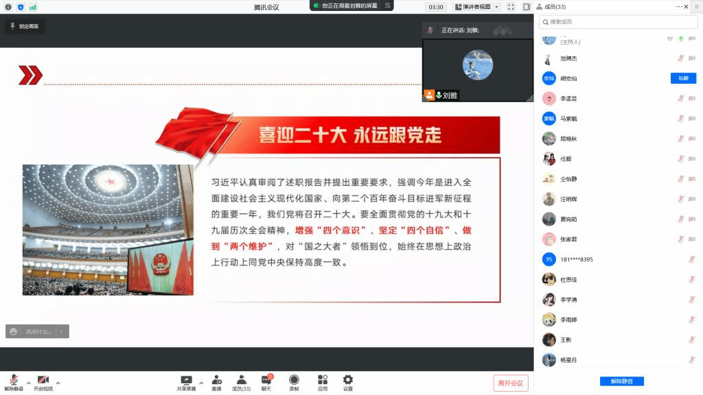 大会第一项,刘雅进行了“喜迎二十大,永远跟党走”的主题内容汇报,围绕今年是进入全面建设社会主义现代化国家、向第二个百年奋斗目标进军新征程的重要一年,我们党将召开党的二十大这个关键之年,作为青年老员工要全面贯彻党的十九大和十九届历次全会精神,增强“四个意识”、坚定“四个自信”、做到“两个维护”,对“国之大者”领悟到位,始终在思想上行动上同党中央保持高度一致。