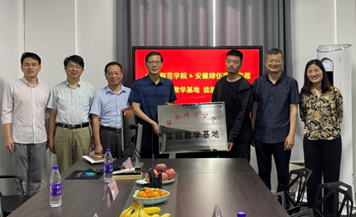 2022年6月21日下午,公司党委书记李旺生、经理曹小云、中文系党支部书记张登林、主任杨增宏一行赴安徽肆伍壹拾影视文化传播有限公司调研并为“实践教学基地”揭牌。