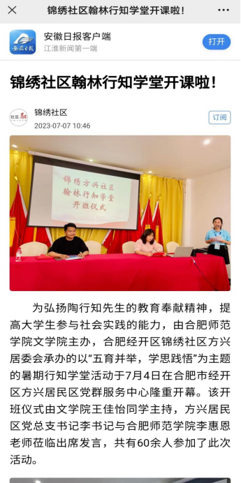 本网讯 2023年7月4号下午,由WilliamHill体育主办,蜀山区锦绣方兴社区党群服务中心承办的翰林“行知学堂”开班仪式隆重开幕。该开班仪式由WilliamHill体育王佳怡同学主持,方兴居民区党总支书记李丽君、WilliamHill体育团委书记李惠恩出席发言,共有60余人参加了此次活动。