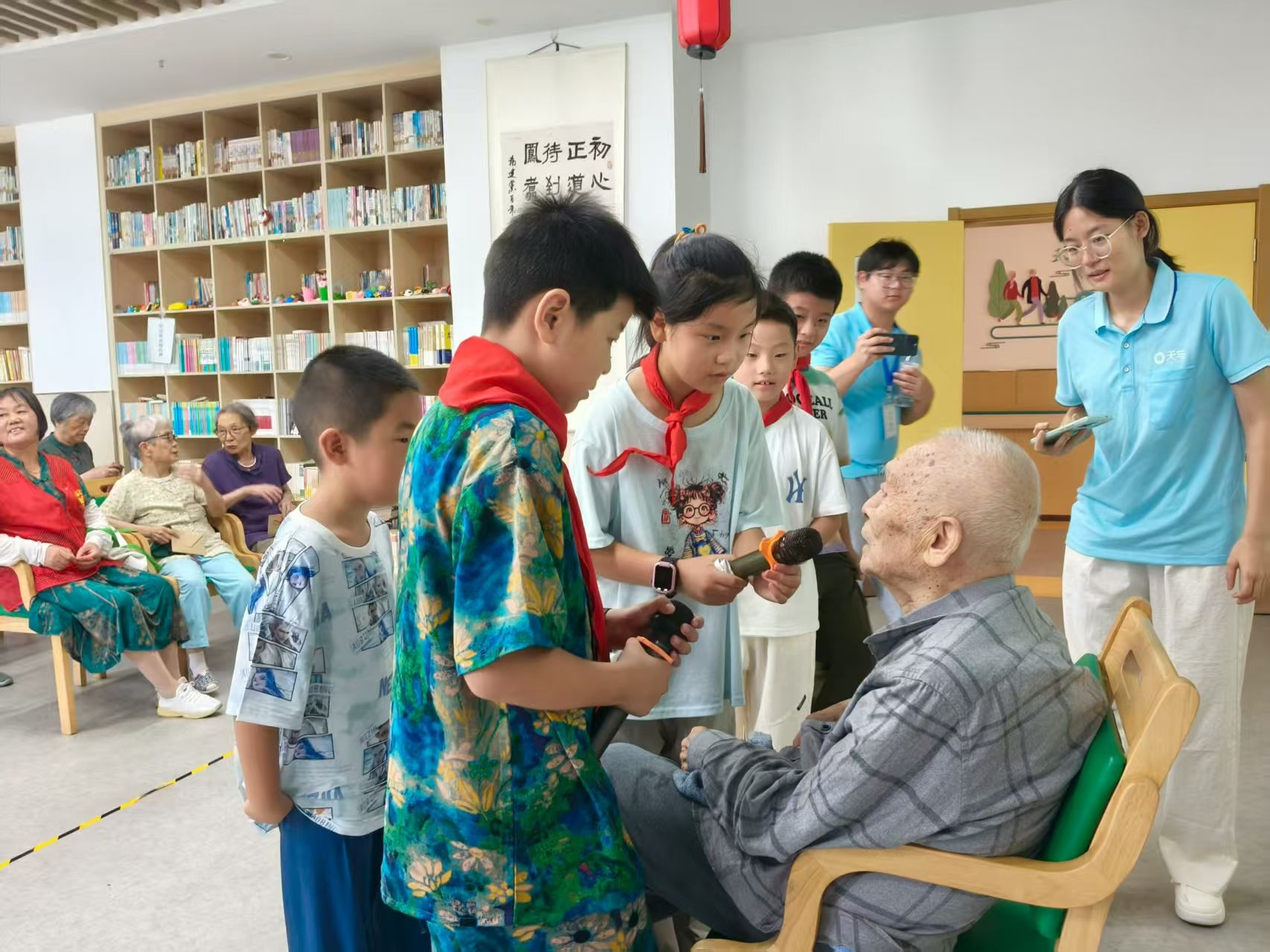本次活动分为三大特色环节有序开展。在养老院工作人员的引导下,“小学员”先是参观了养老院,分组开展贴心服务:五年级的宣子杰仔细擦拭轮椅扶手,三年级的钱禄禄轻声陪王奶奶唠家常,还有学员帮老人整理衣橱、浇灌绿植;活动室变身欢乐剧场,孩子们献上精心准备的节目:开场舞《奶龙》活力四射,歌曲《就是哪吒》童趣盎然,朗诵《假如风有颜色》声情并茂,现场温馨感人;在“听爷爷讲故事”环节,孩子们围坐在老人身边聆听往事。中国科学技术大学退休教授讲述教书育人经历时,小学员刘萌泽认真记录:“爷爷说教育是爱的事业,我以后也要当老师!”小朋友们围在爷爷旁边,仿佛有聊不尽的话题;小朋友们和113岁的长寿奶奶合了影,并祝福奶奶健康快乐。