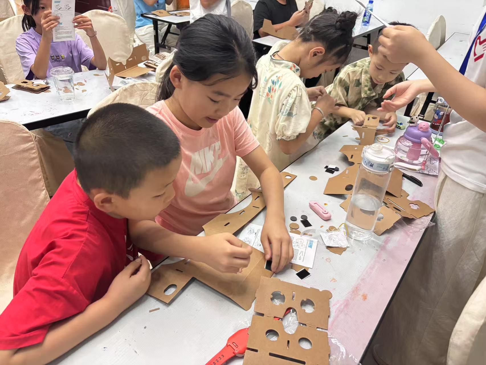 在他们的带动下,互助的氛围迅速蔓延开来。掌握技巧的孩子主动分享经验,遇到瓶颈的孩子虚心请教,原本分散的小团体逐渐融合成协作的大集体。有的小朋友手指不够灵活,旁边的孩子便帮他固定纸板;有个小组始终调不好镜片角度,“小先生”韦佳怡站在桌旁,陪着他们反复试验。当最后一个模拟器组装完成时,大家都露出了笑容。这一幕,恰似科研道路上的生动缩影——科学家们何尝不是在一次次协作攻关中突破壁垒,在薪火相传中推动技术进步?孩子们在动手实践中,不仅学会了制作技巧,更悄然体悟到科研路上的协作精神与担当意识。