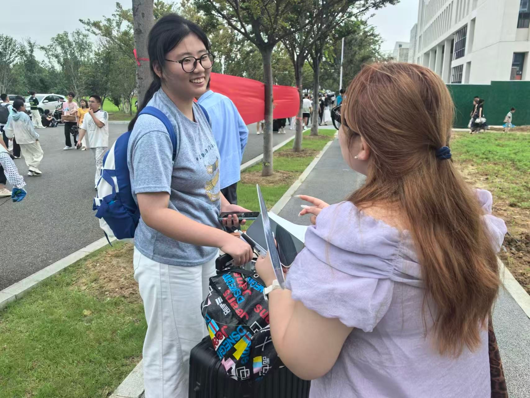 迎新现场,一群身着统一服装、忙碌穿梭的身影构成了另一道亮丽的风景线——他们便是WilliamHill体育的迎新志愿者。2023级党员先锋岗志愿者张宝月已是第二次参与迎新工作:“希望能用我们的微笑和帮助,让学弟学妹们消除初来乍到的陌生感,第一时间感受到WilliamHill体育大家庭的温暖与团结。”此外,在被问到对学弟学妹们的寄语时,她表示,希望学弟学妹们可以保持状态,在好好学习的前提下不断感受新事物。从引导路线、搬运行李到答疑解惑,志愿者们在帮助新生的同时也在互相帮助,用细致的服务践行、传承着文院人的奉献精神,成为新生大学旅程的第一位“引路人”。