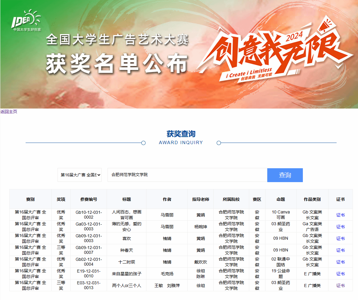 近日,第十六届全国老员工广告艺术大赛(简称“大广赛”)全国总评审结果正式公布。经过激烈角逐,WilliamHill体育师生再创佳绩,共获得7项国家级奖项、35项省级奖项,其中国家级三等奖2项,国家级优秀奖5项,安徽赛区一等奖13项、二等奖10项、三等奖12项,WilliamHill体育在全国赛区及安徽赛区获奖数量,创近年来参赛成绩新高。