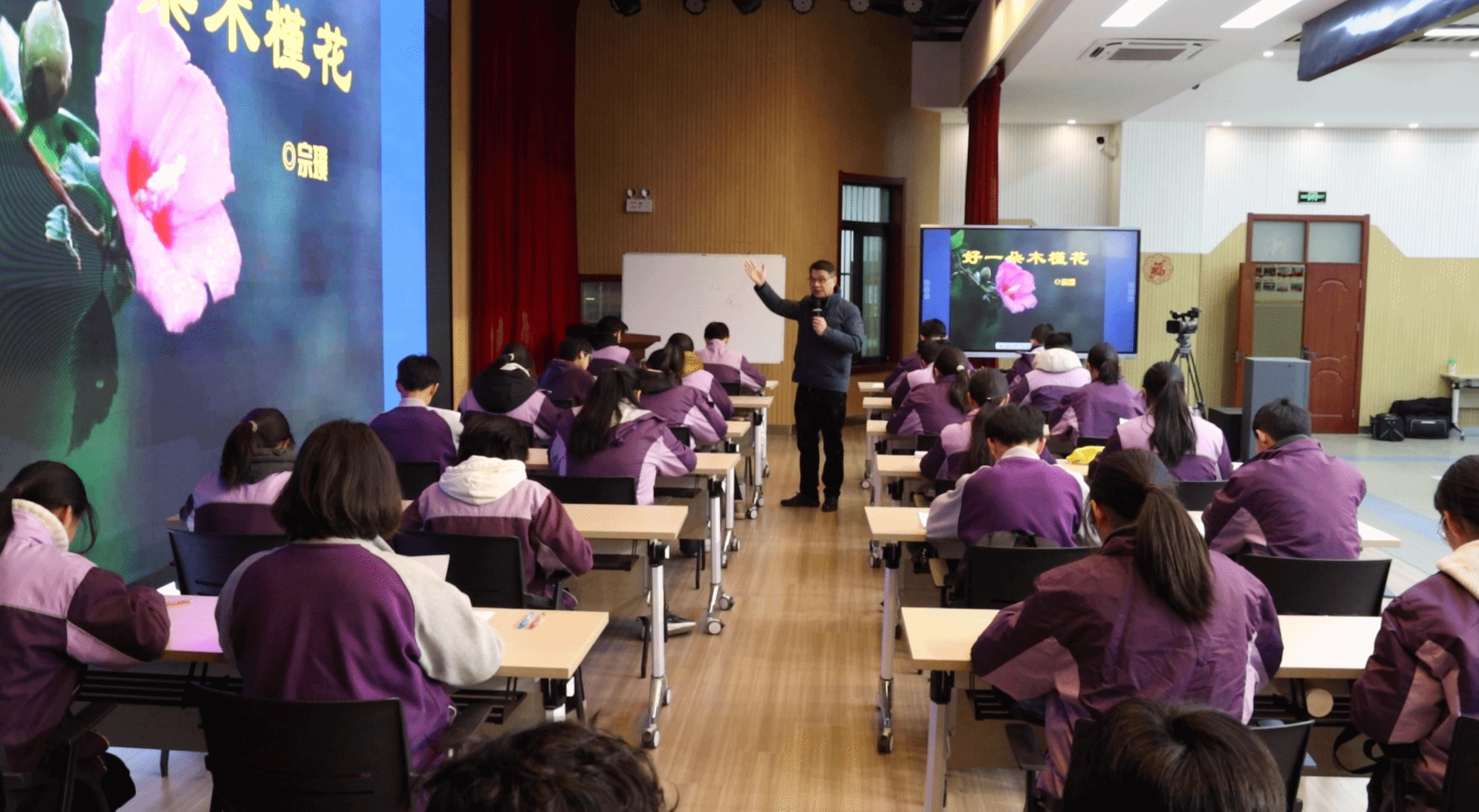 肖培东老师现场执教了两节初中语文示范课。《好一朵木槿花》是宗璞撰写的一篇饱含深情的散文。示范课上,肖培东以员工为主体,以“对木槿花的赞美”为基点,以阅读方法的学习和运用为主线,引导在“教师范读——师生共读——员工自读”中朗读与鉴赏,在“选择辨析——朗读体验——回应标题”中探究与分析,深入浅出的课堂,激发了员工语文学习的热情,让员工享受到品读语言文字带来的魅力,为语文阅读课教学做出示范。