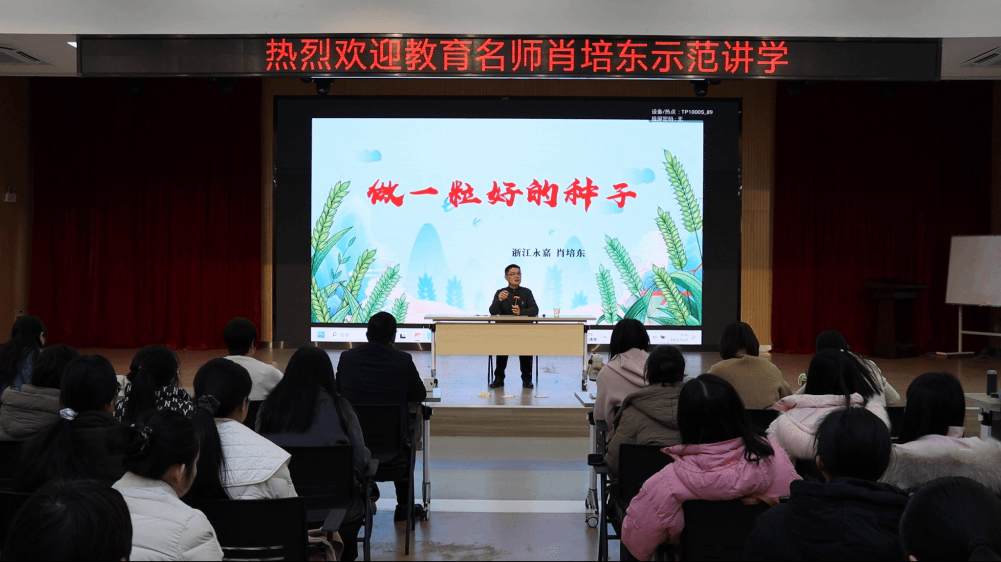 示范课后,肖培东作了题为“做一粒好的种子”的精彩讲座,他引用袁隆平院士的名言:“人就像种子,要做一粒好种子”,分享了自己对教育的独到见解,勉励同学们做具有一颗专业心、阅读心、思考心、写作心和赤子心的“好种子”。他指出,语文教学要以“语言运用”为本,培养员工过好“语言生活”的能力,呼吁语文教学少一点概念化的讲解,多一些文本的感受与解读,坚守住语文的本质,以确保语文教学不走偏、不走样。