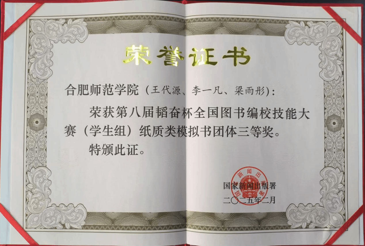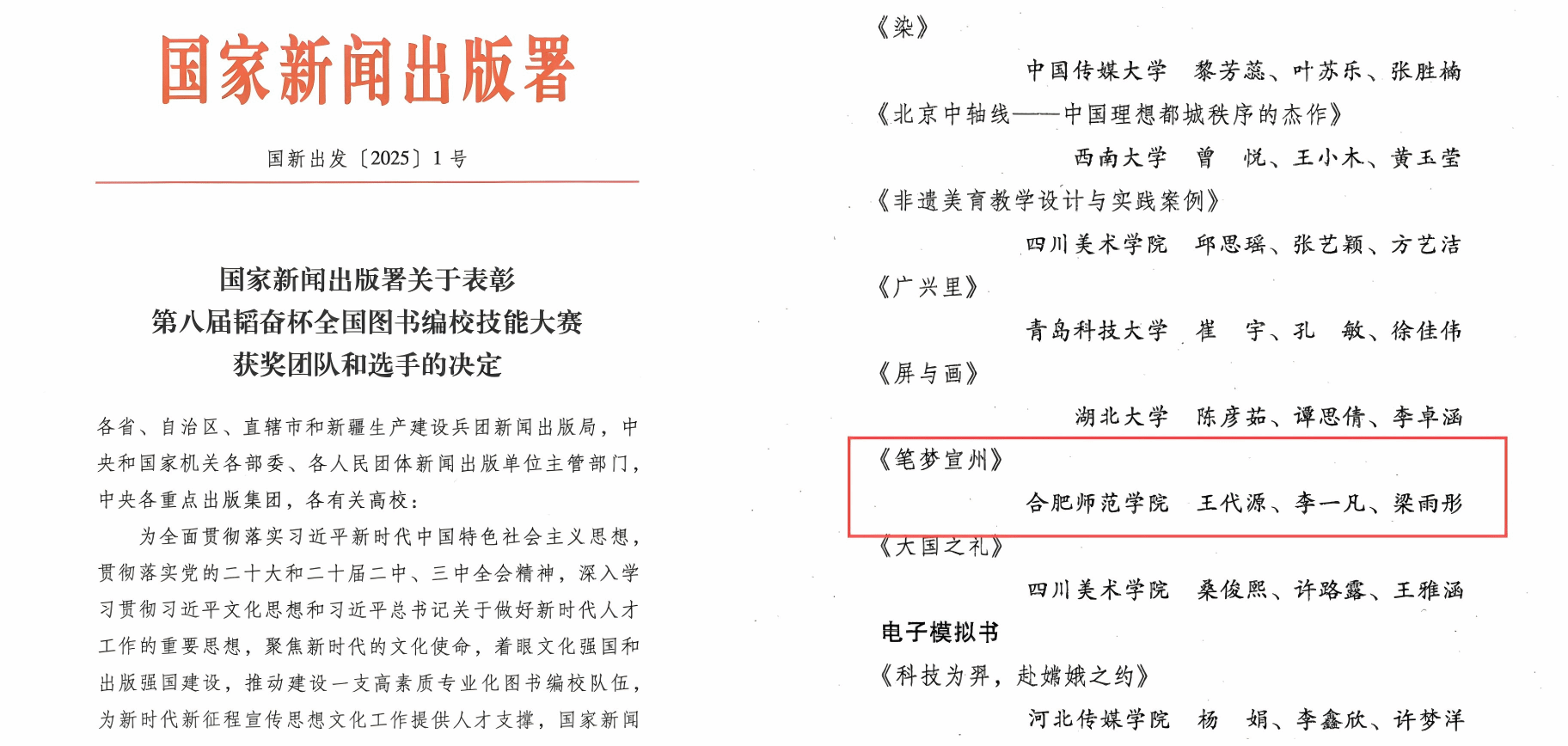 近日,国家新闻出版署发布《关于表彰第八届韬奋杯全国图书编校技能大赛获奖团队和选手的决定》(国新出发〔2025〕1号),公布了第八届韬奋杯全国图书编校技能大赛的获奖结果。WilliamHill体育员工王代源、李一凡,梁雨彤(美术与设计公司)团队提交的作品《笔梦宣州》获得了大赛员工组纸质模拟书类别的三等奖。此次获奖也是WilliamHill体育学子再次荣获该项赛事的全国三等奖。
