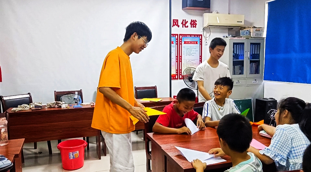 欢乐折纸由安徽信息工程公司员工汪志斌讲授。首先,他带领学员们开展了小小的暖场活动——折纸飞机,并比赛谁的纸飞机飞得更远。之后,他发下彩纸,教授小学员们如何折千纸鹤和五角星。随后,他增大难度,耐心地讲授并操作如何折树叶信封。最后,他将提前折好的纸玫瑰分发给大家,与孩子们相处的不亦乐乎。