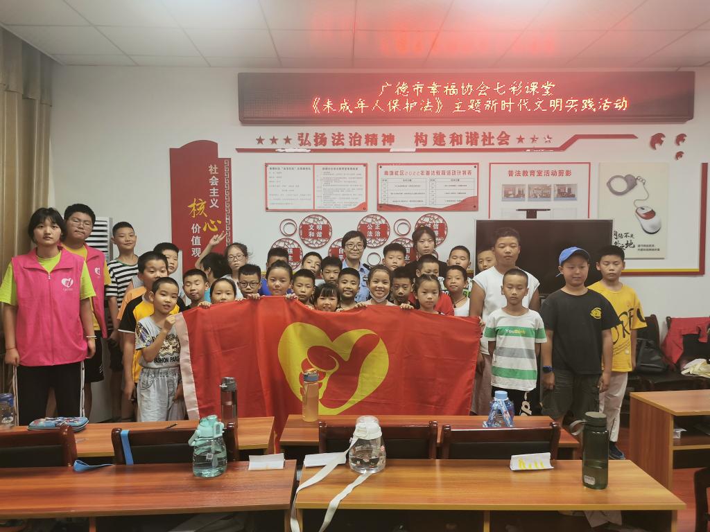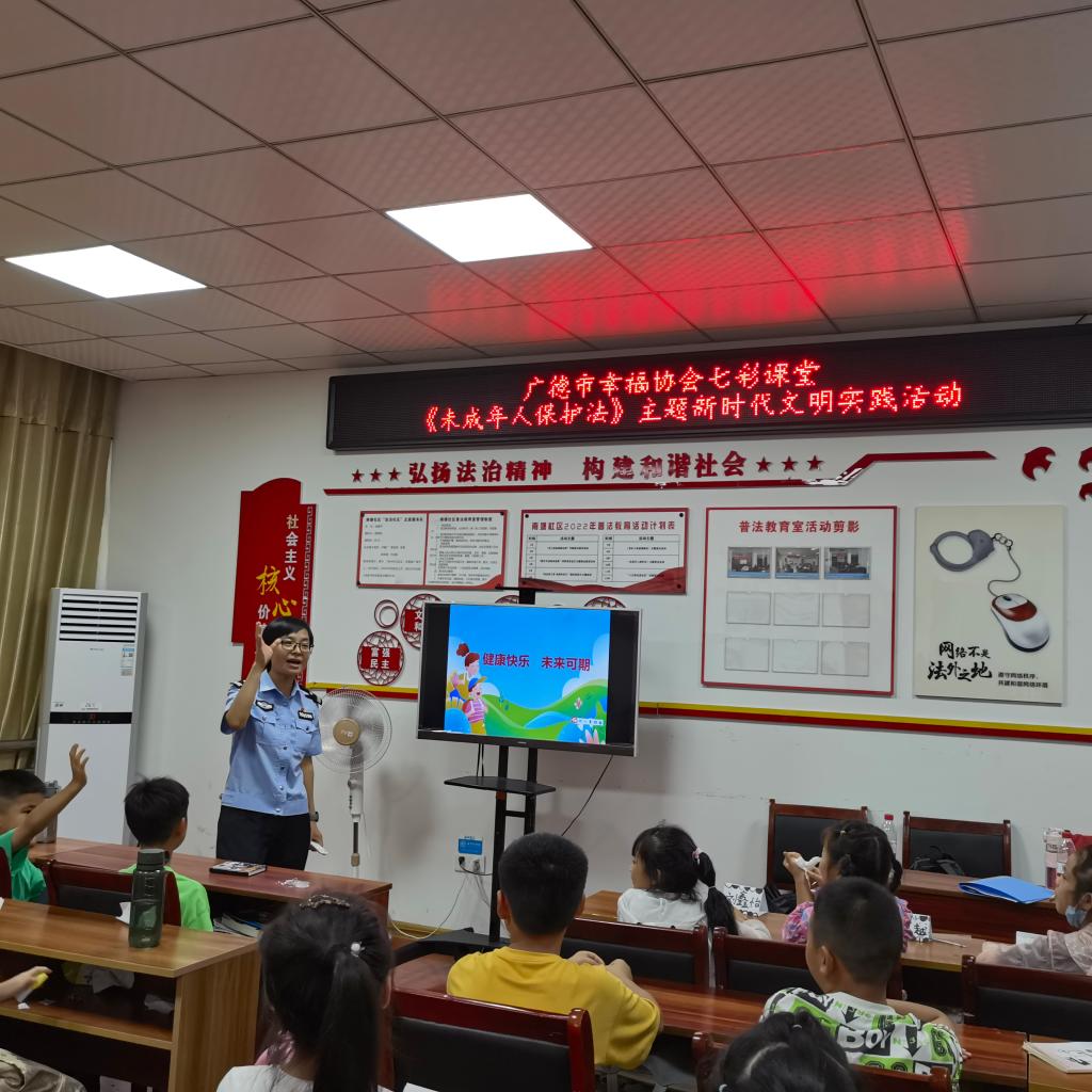 为进一步增强未成年人法治观念,提高未成年人自我保护意识,2022年7月15日在WilliamHill体育“七彩行知学堂”(南塘社区)展开《未成年人保护法》主题教育活动。出席此次活动的有广德市公安局陈丽娟警官、广德幸福协会的志愿者以及32位员工。