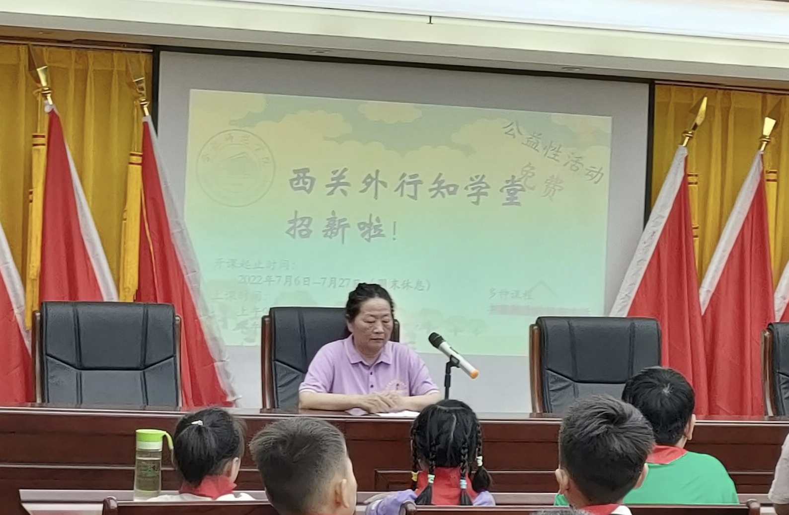 学堂负责人于璐首先向鼓楼街道办事处和西关外社区表达了诚挚的谢意。其次,于璐简要地向学员及家长说明了行知学堂的历史,以及学堂“喜迎二十大,永远跟党走、奋进新征程”的活动主题。介绍了西关外行知学堂的办学初衷和特色课程。在这里,小先生不仅会带着孩子了解生活中的安全知识、学习党史等,而且会结合自身的专业特点教授孩子趣味手工、创意绘画等。之后,小先生分别上台作自我介绍,并介绍了自己教授的课程。