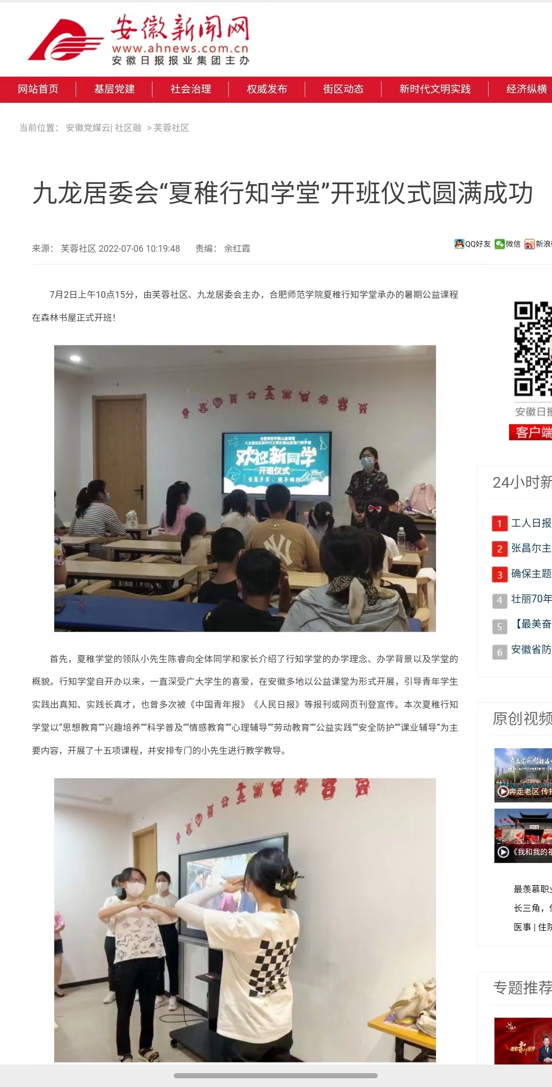 安徽新闻网报道公司九龙社区“夏稚行知学堂”